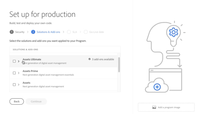Durante la creazione del nuovo programma, nella scheda Soluzioni e componenti aggiuntivi, seleziona Assets Ultimate. Puoi anche espandere Assets Ultimate e selezionare Content Hub per abilitare Content Hub per la distribuzione delle risorse.