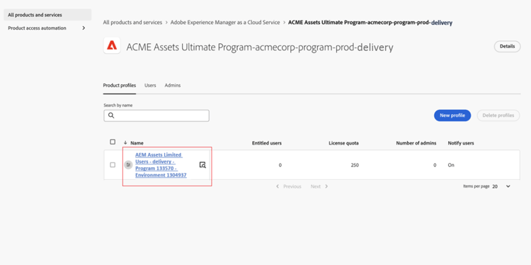 Accedi ai profili di prodotto di Experience Manager Assets facendo clic sul nome del prodotto AEM as a Cloud Service nell’elenco dei prodotti su Admin Console.