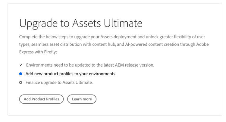 L’amministratore di sistema ha automaticamente diritto come amministratore di AEM su Assets Ultimate e riceve un messaggio e-mail per passare ad Admin Console e gestire i profili di prodotto disponibili.