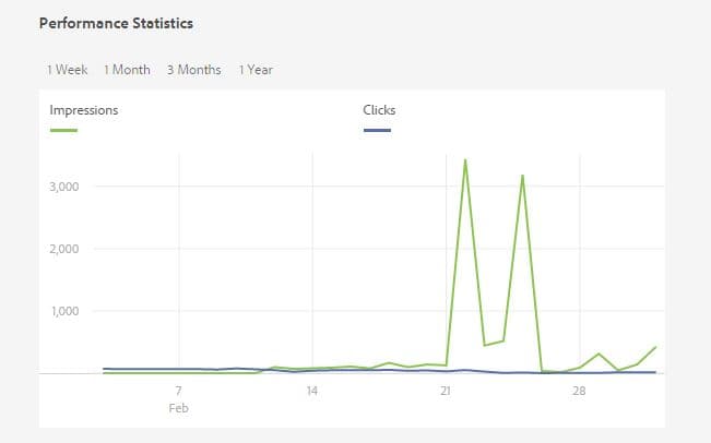 Per visualizzare graficamente le statistiche sulle prestazioni della risorsa in un arco di tempo, seleziona il periodo nella sezione Statistiche di prestazioni. I dettagli, compresi clic e impression, vengono visualizzati come linee di tendenza di un grafico.