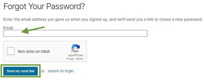 Inserisci l’indirizzo e-mail su cui hai ricevuto l’e-mail di conferma, quindi conferma di voler ricevere il collegamento per reimpostare la password.