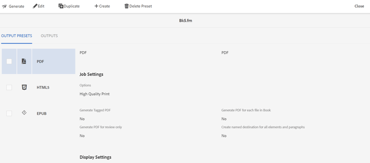 .booko.fmche si desidera pubblicare e fare clic su di esso.Viene visualizzata la console Mappa DITA con l'elenco dei predefiniti di output disponibili per generare l'output.
