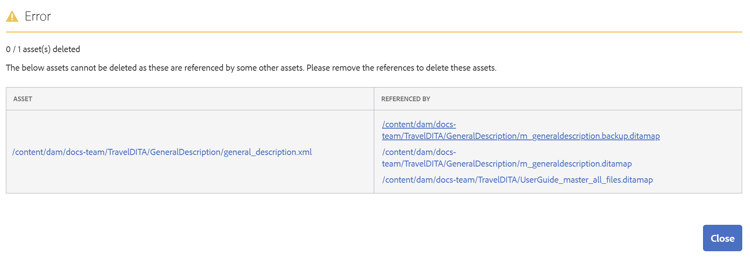 L’eliminazione dei file dal repository di AEM è una funzione limitata controllata dall’amministratore di sistema. In base alle configurazioni, l’eliminazione dei file potrebbe essere soggetta a restrizioni se: