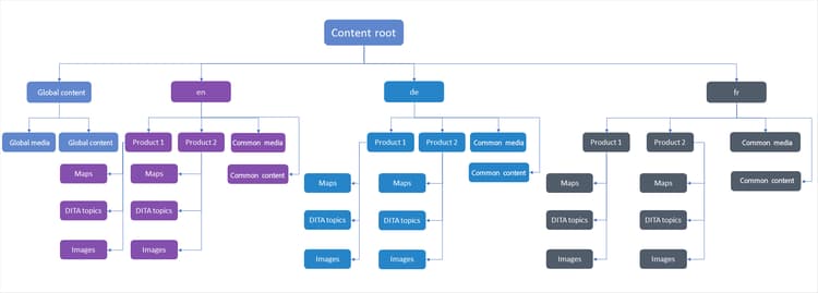 L’illustrazione seguente mostra un esempio di struttura di cartelle in AEM in presenza di contenuto utilizzato a livello globale e tre copie per lingua.