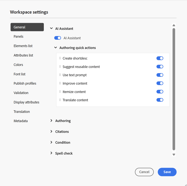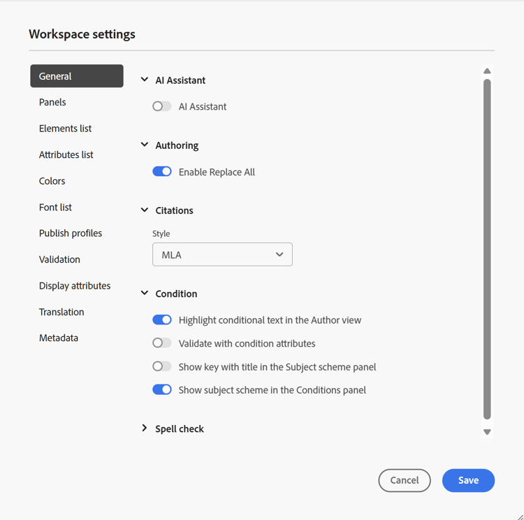 Le impostazioni generali consentono di configurare le impostazioni per l'utilizzo dell'editor. Questa scheda contiene cinque sezioni: Assistente IA, Authoring, Citazioni, Condizione e Controllo ortografico.
