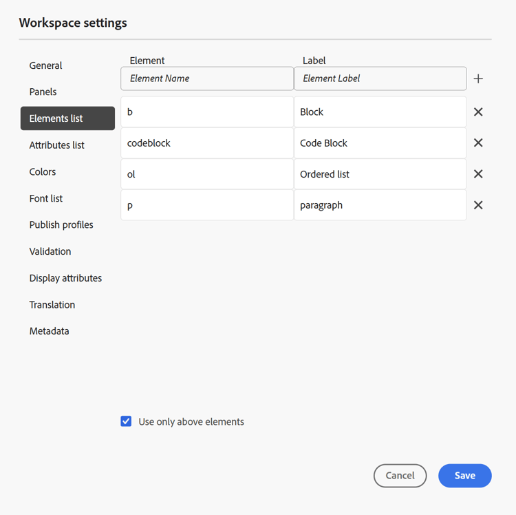 In qualità di amministratore, puoi controllare l’elenco degli elementi che un autore può inserire in un file e definire anche il nome visualizzato dell’elemento. L'impostazione dell'elenco Elementi consente di specificare il nome dell'elemento in base alle specifiche DITA e un'etichetta che si desidera utilizzare al posto del nome dell'elemento definito DITA: