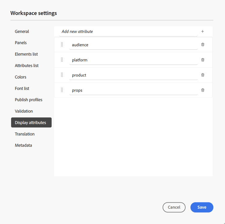 Analogamente all'elenco Attributi, è possibile controllare l'elenco degli attributi da visualizzare nell'elenco degli attributi di un elemento. Per impostazione predefinita, quattro Attributi di visualizzazione: pubblico, piattaforma, prodotto e proprietà sono stati configurati per essere visualizzati nell'elenco degli attributi di un elemento. Puoi anche aggiungere un attributo di visualizzazione utilizzando l'icona Aggiungi nella parte superiore. Puoi anche eliminare gli attributi di visualizzazione utilizzando l'icona Elimina.