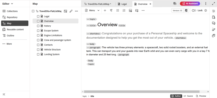 Experience Manager Guides consente agli autori di aprire una mappa DITA nell'Editor e di visualizzare il posizionamento degli argomenti all'interno della mappa. In questo modo gli autori possono sapere esattamente dove si trova l’argomento all’interno della mappa e creare contenuti più rilevanti. Inoltre, se più autori lavorano a un progetto, possono sapere quali argomenti sono disponibili nella mappa e riutilizzare il contenuto, se necessario.