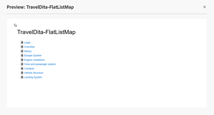 Interfaccia utente di Assets: nell'interfaccia utente di Assets, passare alla posizione della mappa, selezionare il file della mappa e scegliere Anteprima mappa nella barra degli strumenti. L’anteprima della mappa viene visualizzata in una nuova scheda. È possibile visualizzare il contenuto di tutti gli argomenti nella modalità anteprima. In questa visualizzazione non è possibile modificare alcun argomento.