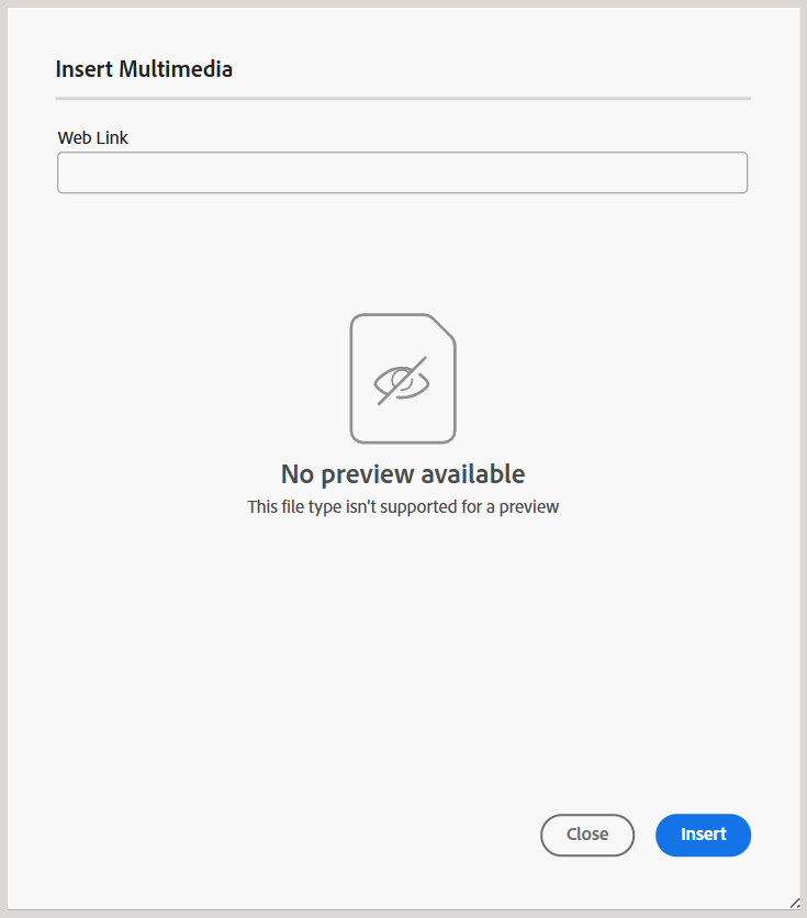 Se scegli YouTube o Vimeo, viene visualizzata la finestra di dialogo Inserisci file multimediali. Incollare il collegamento del file video nel campo Collegamento Web e selezionare Inserisci per aggiungere il video nella posizione valida corrente o successiva nel documento.