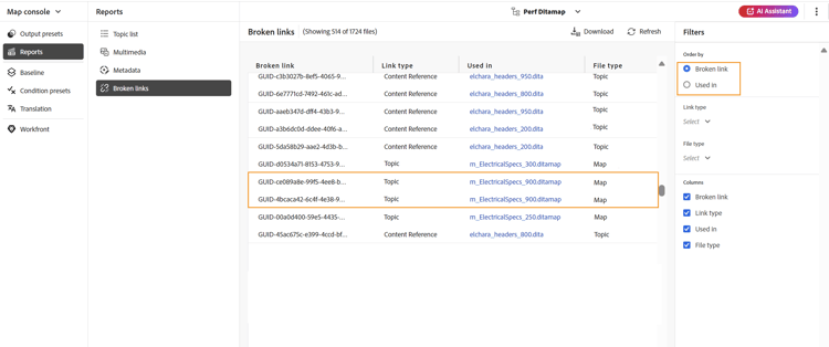 Collegamenti interrotti è un report utile che fornisce i dettagli dei collegamenti interrotti presenti nella mappa corrente. È possibile visualizzare i collegamenti interrotti, che possono essere per argomenti DITA, riferimenti a file multimediali, riferimenti a chiavi di contenuto e così via. Inoltre, è possibile correggerli direttamente qui.