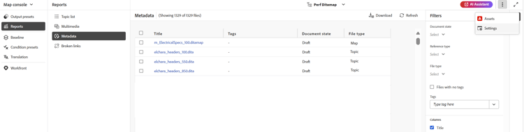 Il report metadati fornisce un report dettagliato dei riferimenti nella mappa DITA corrente, ad esempio il tipo di riferimento, lo stato del documento, i tag, la posizione del file e così via.
