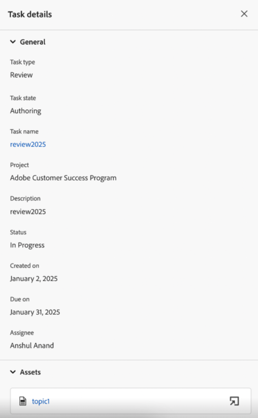 Inoltre, puoi aggiungere o rimuovere risorse quando modifichi un’attività di authoring, pubblicazione o traduzione. Tuttavia, per un’attività di revisione, è possibile modificare solo la versione delle risorse inviate per la revisione.