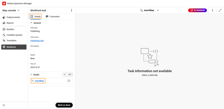 Al termine della pubblicazione, passare alla sezione Workfront e selezionare Contrassegna come completato per indicare che l'attività è stata completata.