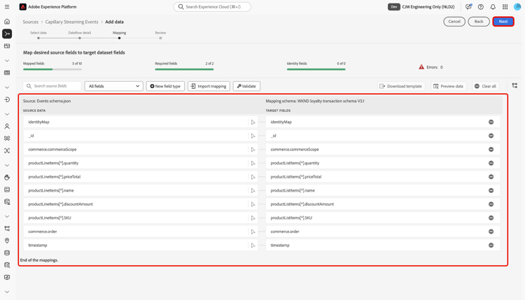 Utilizza l’interfaccia di mappatura per mappare i dati di origine sui campi dello schema appropriati prima di acquisire i dati in Experience Platform. Per ulteriori informazioni, leggere la guida alla mappatura nell'interfaccia utente.