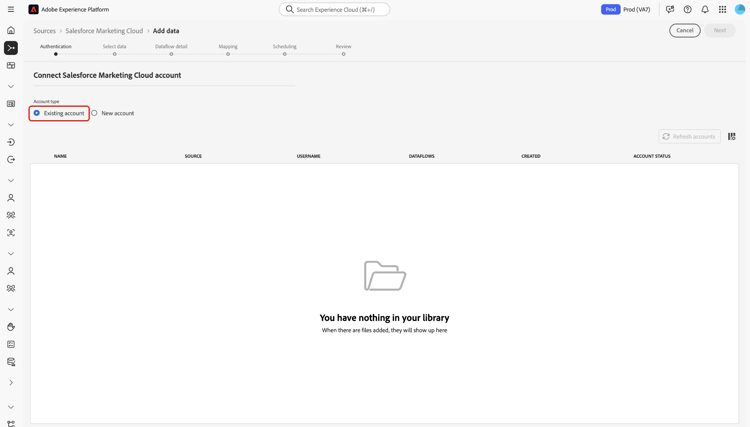 Per utilizzare un account esistente, selezionare Account esistente, quindi selezionare l'account Salesforce Marketing Cloud che si desidera utilizzare.