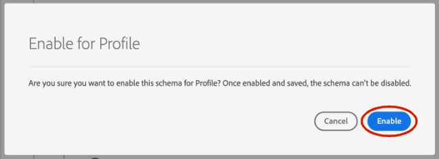 Viene visualizzato un popover che avvisa che uno schema, una volta attivato e salvato, non può essere disattivato. Selezionare Enable per continuare.