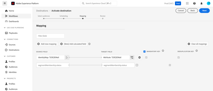Nel passaggio Mappatura, seleziona l'attributo e i campi di identità da esportare per il pubblico. Per ulteriori informazioni, vedi il passaggio di mappatura nella documentazione di Adobe Experience Platform.