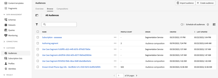La scheda Sfoglia elenca tutti i tipi di pubblico esistenti memorizzati in Adobe Experience Platform.