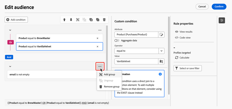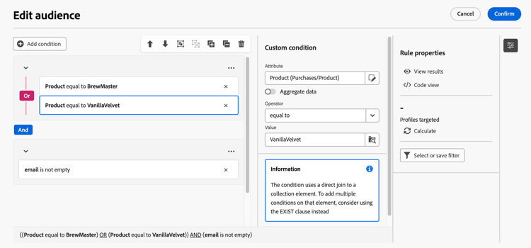 Nell’esempio seguente, è stato creato un gruppo intermedio per il targeting di clienti che hanno acquistato il prodotto BrewMaster o VanillaVelvet.