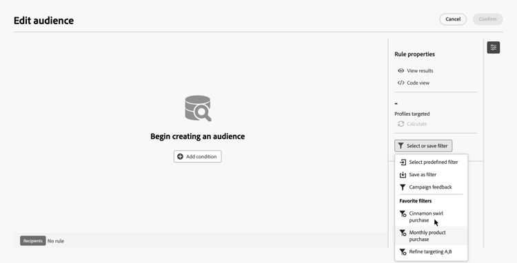 I filtri predefiniti sono regole salvate che puoi riutilizzare nel generatore di regole. Utilizzale per evitare di ricostruire le query comuni e per standardizzare la logica di targeting tra campagne orchestrate.