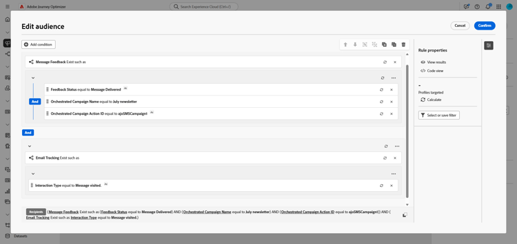 Ora hai configurato una regola di retargeting basata sul feedback per identificare i destinatari in base allo stato di consegna di un messaggio precedente, ad esempio inviato, aperto, non recapitato o contrassegnato come spam. Una volta definito questo pubblico, puoi aggiungere un'e-mail di follow-up o perfezionare ulteriormente il targeting configurando una regola di retargeting basata sul tracciamento, che utilizza i dati di interazione dell'utente.