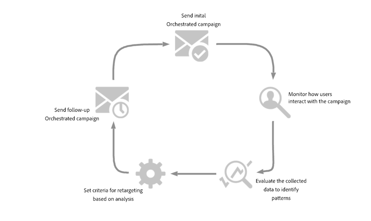 Il retargeting ti consente di monitorare i destinatari in base al modo in cui hanno risposto a una campagna orchestrata precedente. Ad esempio, puoi inviare una seconda e-mail ai destinatari che hanno ricevuto ma non hanno fatto clic sul primo.