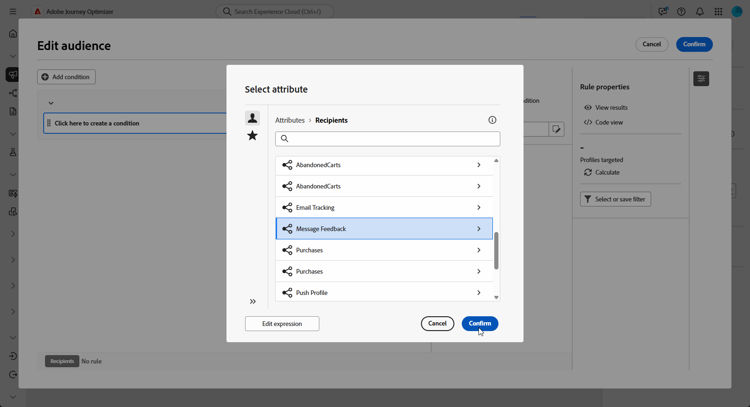 Nel Generatore regole, fai clic su Aggiungi condizione e seleziona Feedback messaggio dal Selettore attributi. Fai clic su Conferma per creare Il feedback del messaggio esiste, ad esempio condizione.