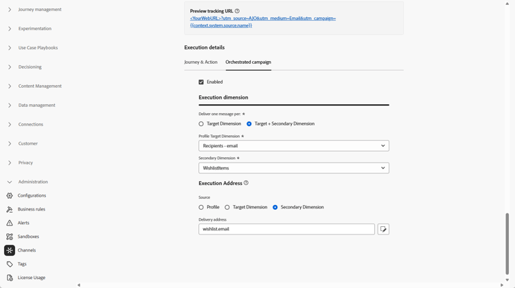 Recipients - emailcome Dimension di destinazione profilo eWishlistitemscome dimensione secondaria.Dal menu Indirizzo di esecuzione, selezionare