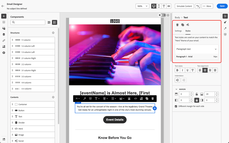 Una volta iniziato a creare il contenuto delle e-mail in Journey Optimizer, è possibile modificare una serie di parametri e attributi di stile dal riquadro Stili di E-mail Designer.