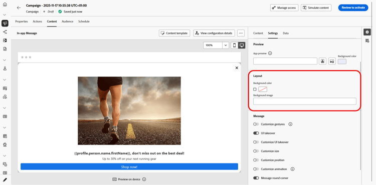 Dalla scheda Impostazioni, puoi definire il layout del messaggio e visualizzare l'anteprima del messaggio in-app. Puoi anche accedere alle opzioni di formattazione avanzate.