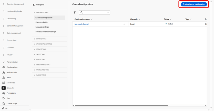 Accedi al menu Canali > Impostazioni generali > Configurazioni canale, quindi fai clic su Crea configurazione canale.