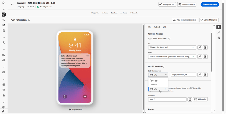 Dopo aver creato una notifica push, puoi progettarne il contenuto per le piattaforme iOS e Android. Questa pagina ti guida attraverso la composizione del messaggio, la configurazione del comportamento al clic, l’aggiunta di supporti e pulsanti e l’impostazione di opzioni avanzate per creare notifiche push coinvolgenti che risuonano con il tuo pubblico.