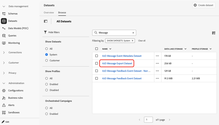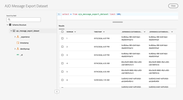 Dopo aver inviato i messaggi utilizzando una configurazione di canale con Esportazione messaggi abilitata, puoi accedere ai dati esportati e rivederli nel Set di dati di esportazione messaggi di AJO.