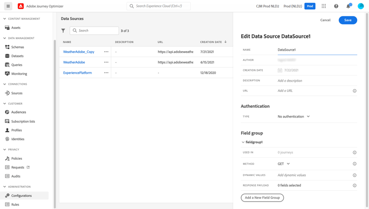 cacheDuration di Journey Optimizer , soprattutto in caso di carichi di lavoro pesanti, per evitare incongruenze di scadenza ed errori 401.Creare e configurare un’origine dati esterna create-ext-data-sources