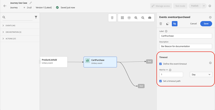 Dal menu Evento, seleziona le opzioni Definisci timeout evento e Imposta un percorso di timeout.