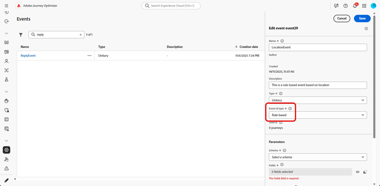 note note NOTE Per gli eventi generati dal sistema, accertati di aver aggiunto il gruppo di campi "orchestrazione" allo schema XDM. In questo modo lo schema conterrà tutte le informazioni necessarie per l'utilizzo di Journey Optimizer.