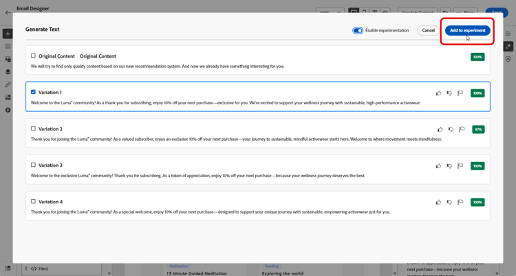 Dopo aver creato e personalizzato i messaggi, eleva il contenuto con l’Assistente IA in Adobe Journey Optimizer, che include la funzione Esperimento contenuti. Questo strumento consente di definire più trattamenti di consegna, con contenuti diversi, per misurare le prestazioni per il pubblico di destinazione.