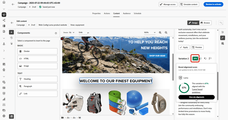 Fai clic sull'icona percentuale per visualizzare il punteggio di allineamento del brand e identificare eventuali disallineamenti con il brand.