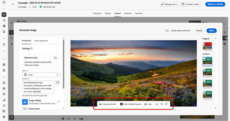 L’Assistente AI in Journey Optimizer può aiutarti a ottimizzare l’impatto delle consegne suggerendo contenuti diversi che hanno maggiori probabilità di risuonare con il tuo pubblico.