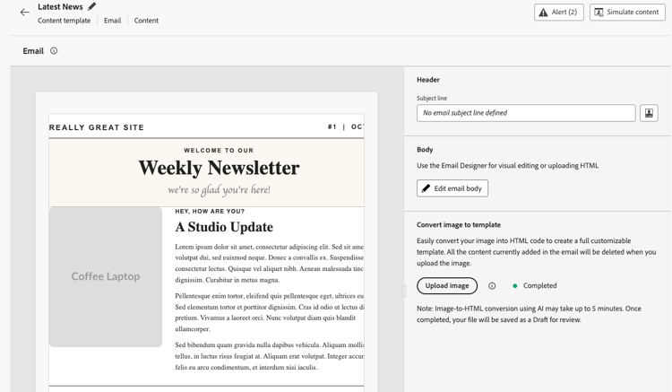 Journey Optimizer consente di velocizzare notevolmente la creazione di e-mail convertendo le progettazioni di immagini statiche in modelli di contenuto e-mail HTML modulari e completamente personalizzabili.