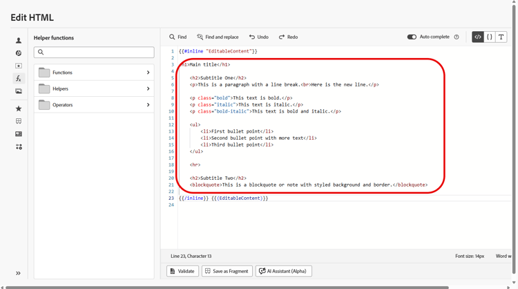 È possibile aggiungere testo formattato come interruzioni di riga, grassetto, corsivo e così via a un frammento modificabile utilizzando i componenti di HTML. A questo scopo, segui i passaggi riportati qui sotto.