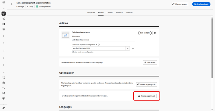 Nella sezione Ottimizzazione, seleziona Crea esperimento.