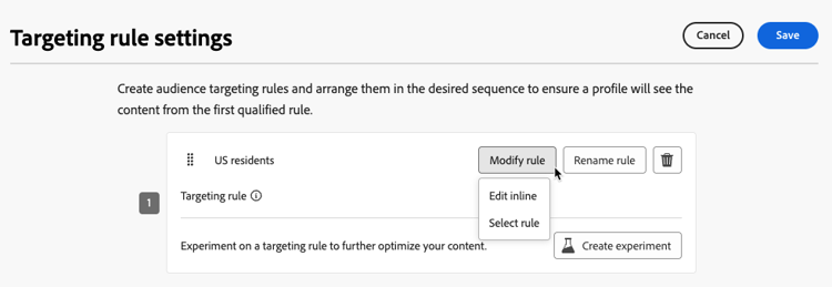 Puoi anche fare clic su Crea regola > Seleziona regola per selezionare una regola di targeting esistente creata dal menu Regole. Ulteriori informazioni