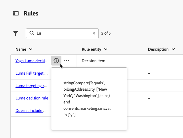 L'elenco delle regole è accessibile nel menu Decisioning > Imposta strategia.