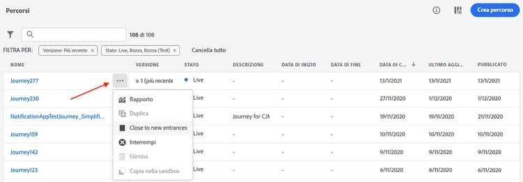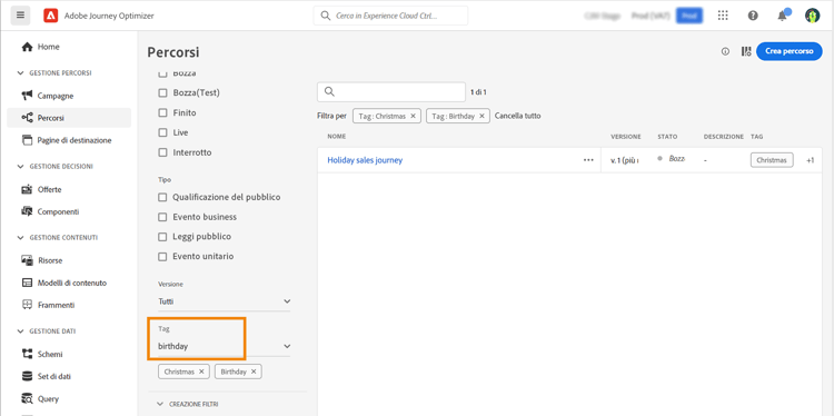 È inoltre possibile utilizzare i tag unificati per filtrare un elenco in base ai tag assegnati a un oggetto. Per il momento, i tag sono disponibili per percorsi e campagne. Scopri come utilizzare i tag