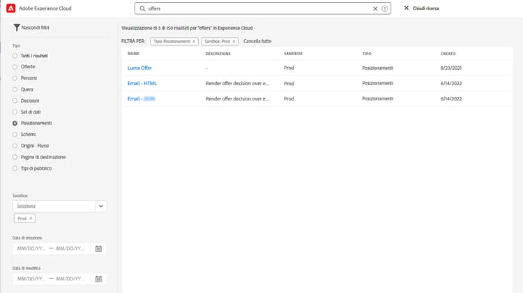 Dall’interfaccia di Adobe Journey Optimizer, utilizza la funzione di ricerca unificata di Adobe Experience Cloud al centro della barra superiore per trovare risorse, percorsi, set di dati e altro nelle tue sandbox.
