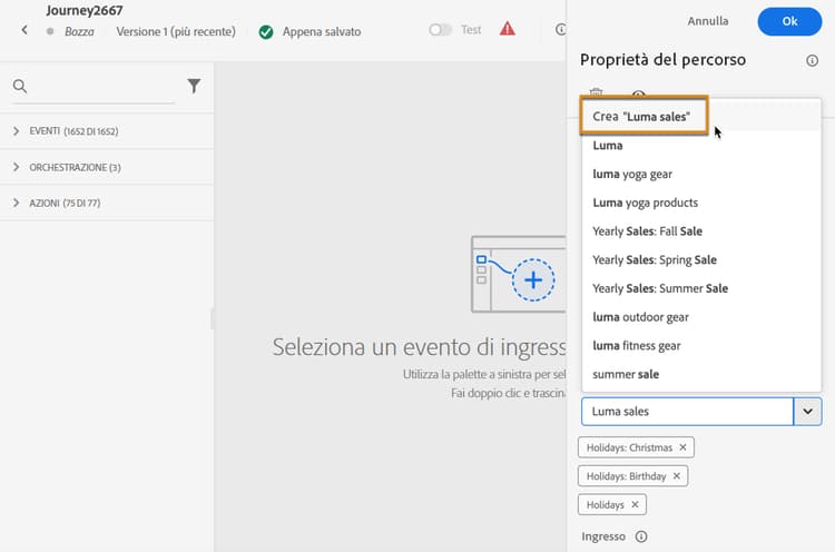 Se il tag che stai cercando non è disponibile, fai clic su Crea “” per definirne uno nuovo: verrà aggiunto automaticamente all’oggetto corrente e sarà disponibile per tutti gli altri oggetti.