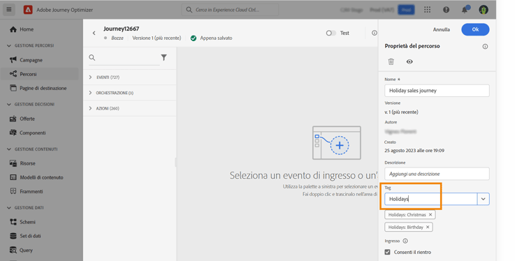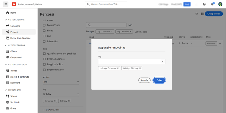 Con i Tag unificati di Adobe Experience Platform, è possibile classificare facilmente gli oggetti Journey Optimizer per migliorare la ricerca dagli elenchi.