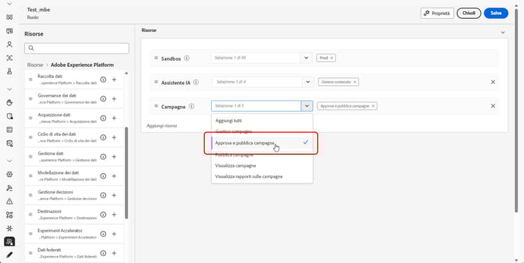 Per accedere ai percorsi e alle campagne di approvazione e pubblicazione, è necessario concedere agli utenti le autorizzazioni Approva e pubblica campagne e Approva e pubblica percorsi. Ulteriori informazioni